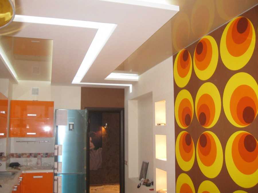 Если у вас два уровня потолка, один из них по цвету может сливаться со стенами, другой же дополнять гарнитур, стол, шторы, люстра, картина, напольное покрытие или кухонный фартук – к примеру, как на этих фото.