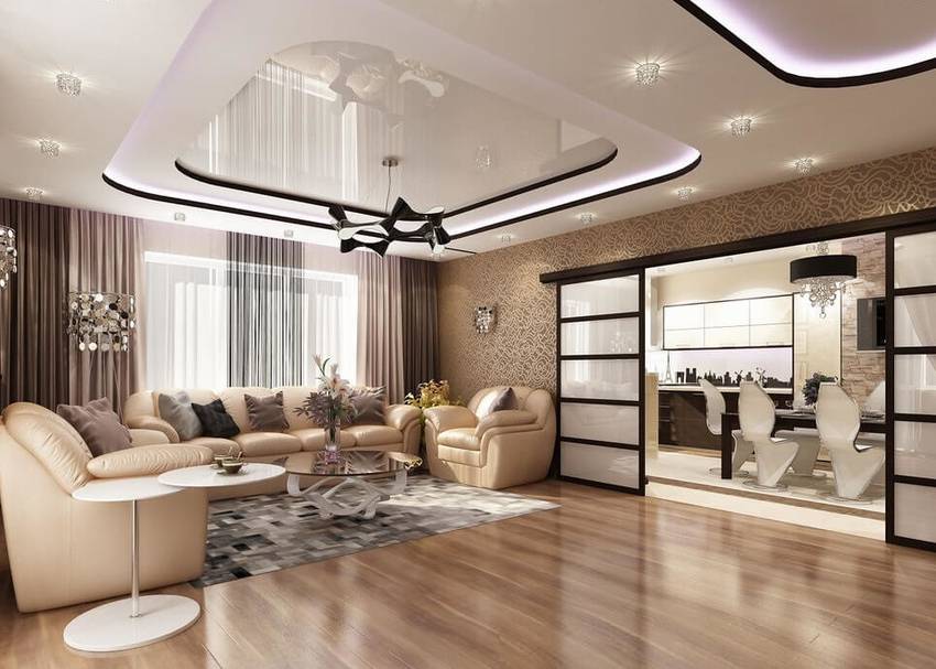 - Геометрические фигуры. Их применяют тогда, когда хочется сделать оригинальный дизайн потолка, при этом не затратив много места. Ведь такие фигуры могут иметь в основании треугольник и ромб, прямоугольник и овал. Такие фигуры нередко становятся частью современного интерьера.