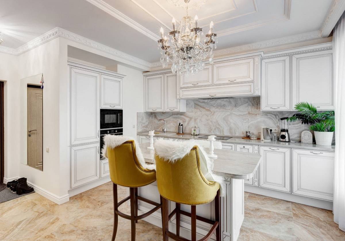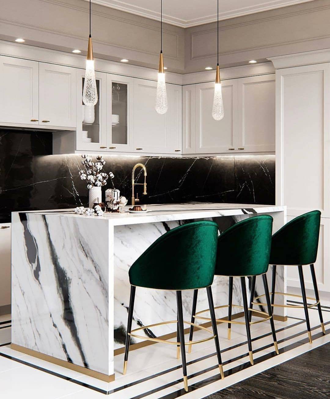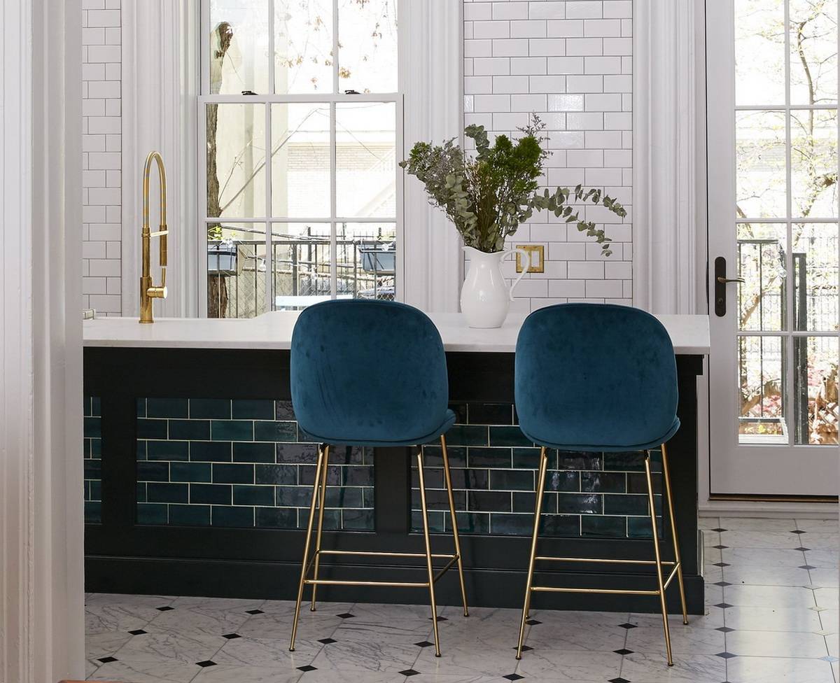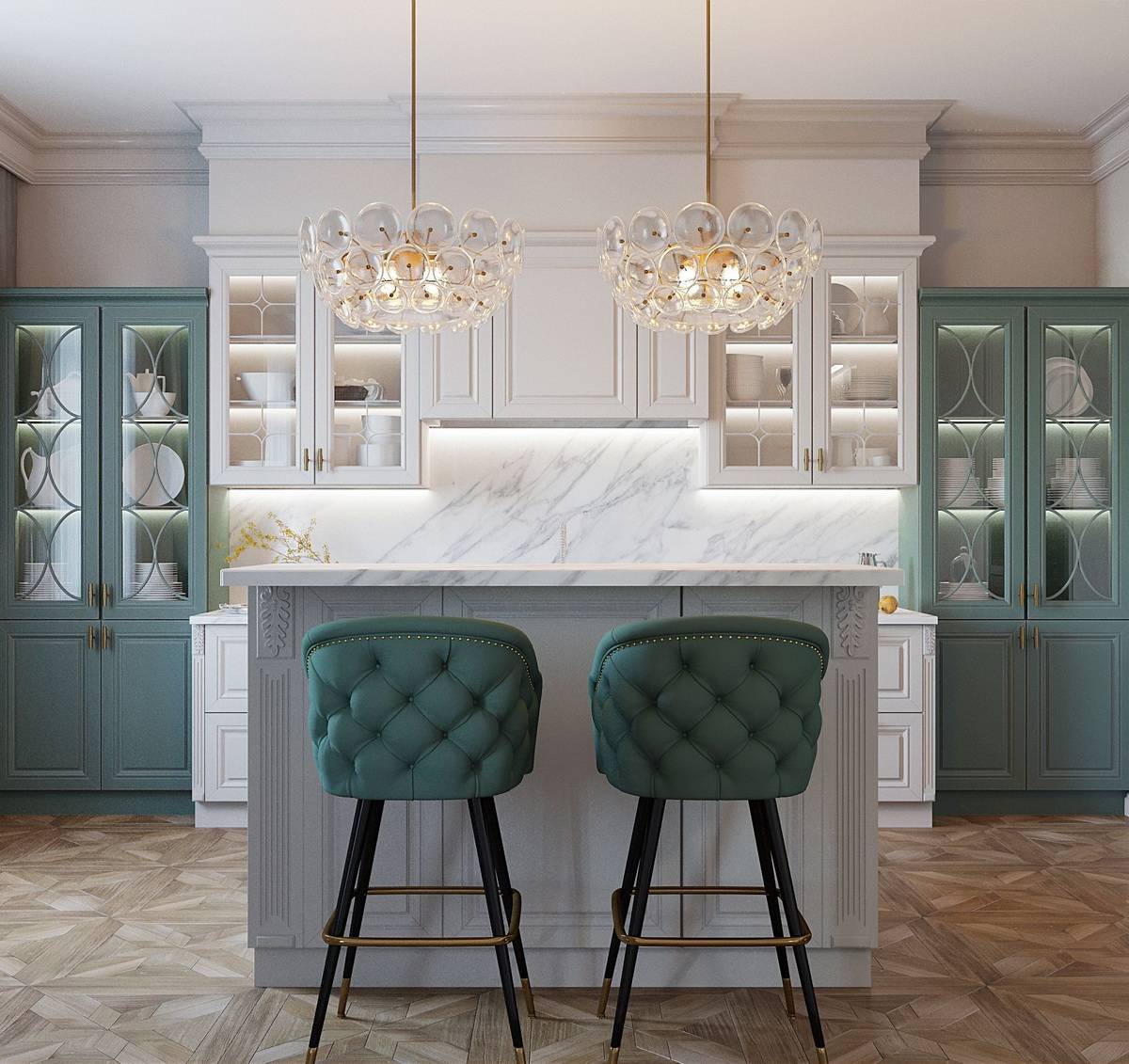 Бархат – изысканный вариант, который создаст на кухне атмосферу комфорта, уюта и одновременно шика. Этот материал сочетает в себе элегантный внешний вид и приятные тактильные свойства. При этом с помощью бархатных стульев можно добавить в кухню цветовой акцент. Выбирайте обивку насыщенных глубоких цветов с эффектным блеском – бирюзовый, малиновый, розовый, изумрудный или бордо.