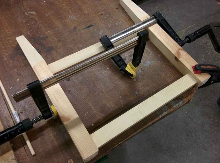 - Бруски, которые используют для опоры сиденья, просверливают для установки металлического прута.