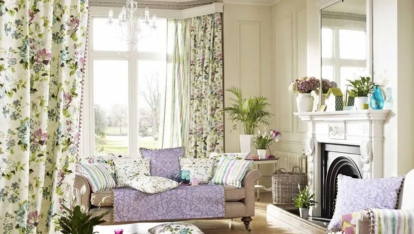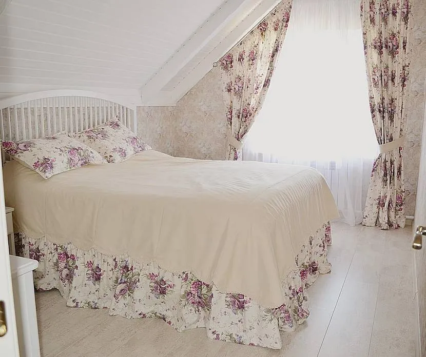 - Занавески в комнатах выполняются из однотонных светлых тканей с цветочными узорами.