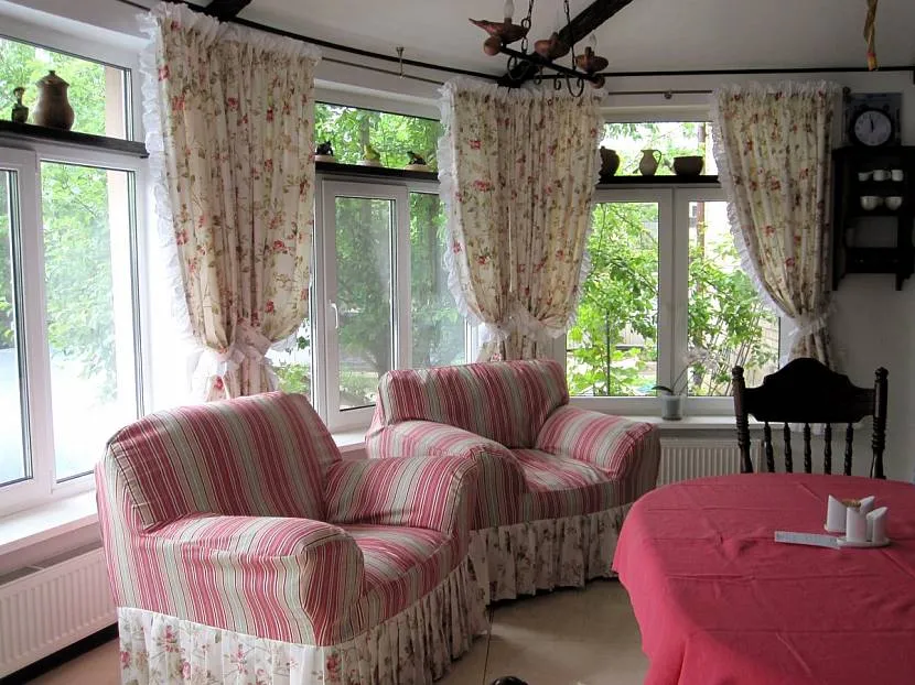 На окнах должны быть легкие шторы, которые не будут препятствовать прохождению свежего воздуха и солнечного света. При этом они обязательно должны быть сделаны из натуральных материалов – лен, хлопок. Какими они будут – однотонными, в клеточку или с мелким цветочком зависит от общего интерьера.