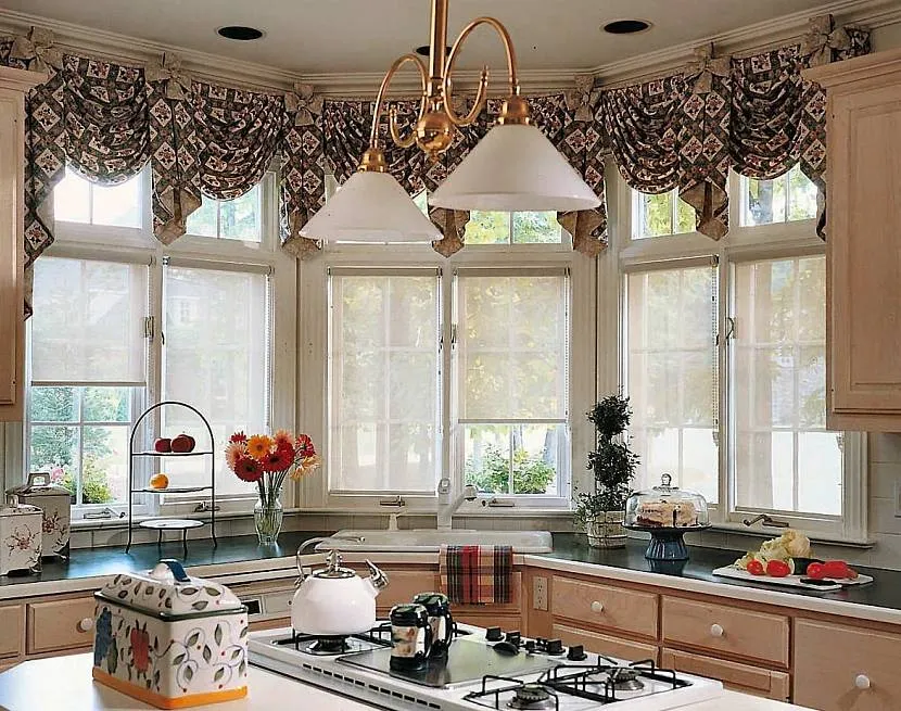 Австрийские — самый красивы вид занавесок. Их торжественность обусловлена горизонтальными складками, образующимися в собранном состоянии. В открытом виде они выглядят ровным полотном. Красиво смотрятся на высоких окнах и не отягощают интерьер даже в небольшой кухне.