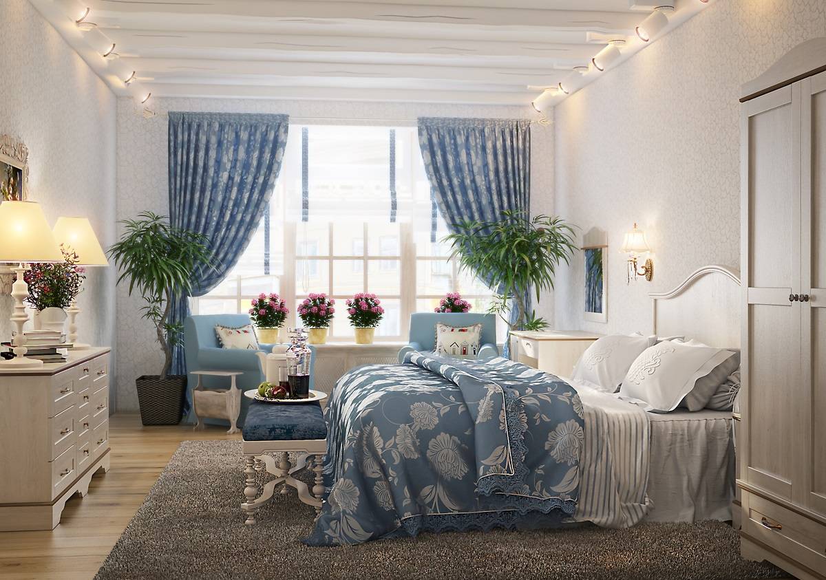 Еще одним удачным решением является синий колер. Он ассоциируется с безоблачным летним небом. Удачнее всего смотрится в дуэте с белоснежным. Большинство оттенков синего приятны для глаз и поднимают настроение. Прованский интерьер спальни в такой гамме будет смотреться более лаконично. В то время как розовая палитра больше подходит для комнаты молодой девушки.