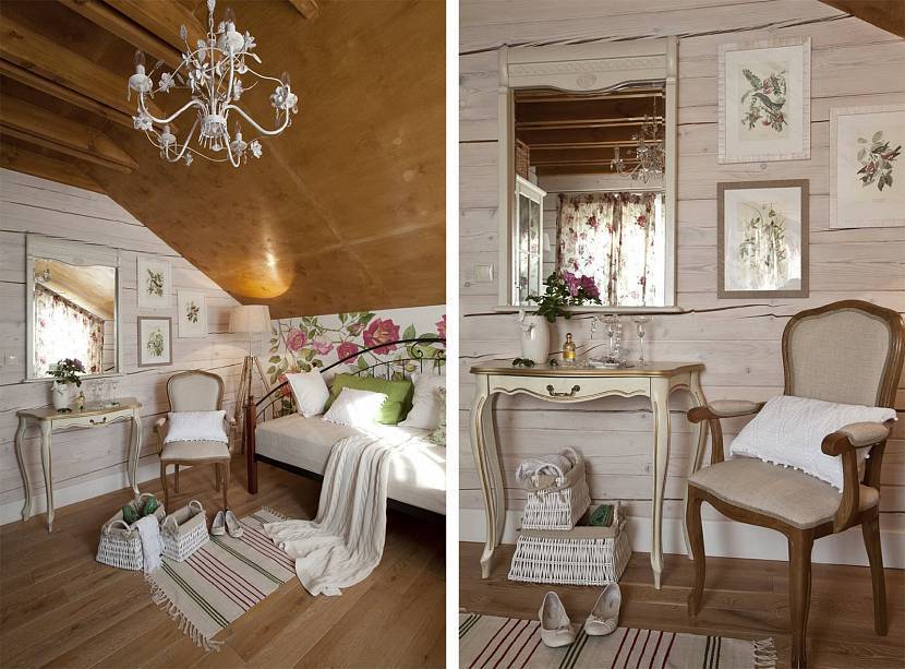 Так же как и в случае с полом, на стенах допускаются потертости и небольшие неровности. Можно даже оставить кирпичную кладку, если она смотрится аккуратно. Обычно сверху стена выкрашивается белой или другой светлой краской. В качестве отделки можно использовать молдинг, штукатурку и гипс. Если же вы предпочитаете обои, то они непременно должны иметь цветочный орнамент.