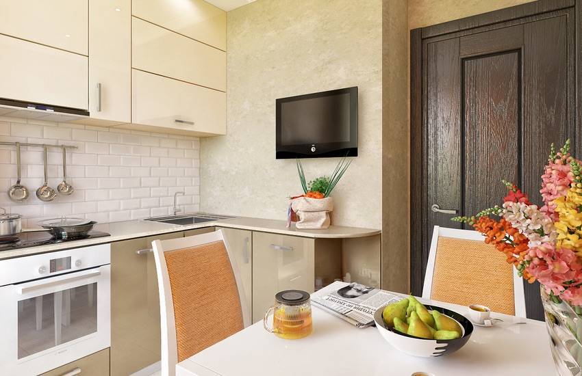 При подборе конкретного места для размещения устройства важно учесть и дизайн кухни. Телевизор должен органично вливаться в обстановку, подчеркивать стиль интерьера.