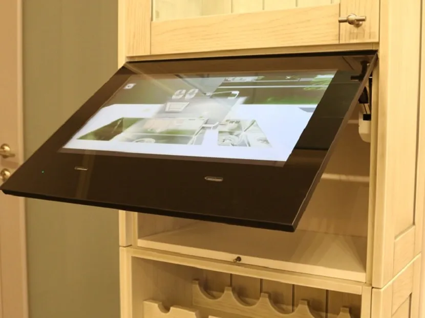 Из этой же серии телевизоры, спрятанные в мебель. Вручную или автоматически прибор, как по волшебству, появляется из шкафчика или из столешницы. Удобно и функционально.