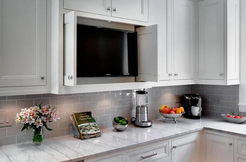 Маленький откидной телевизор, подобный тем, что установлены в самолетах, также будет хорошим вариантом для кухни небольших размеров