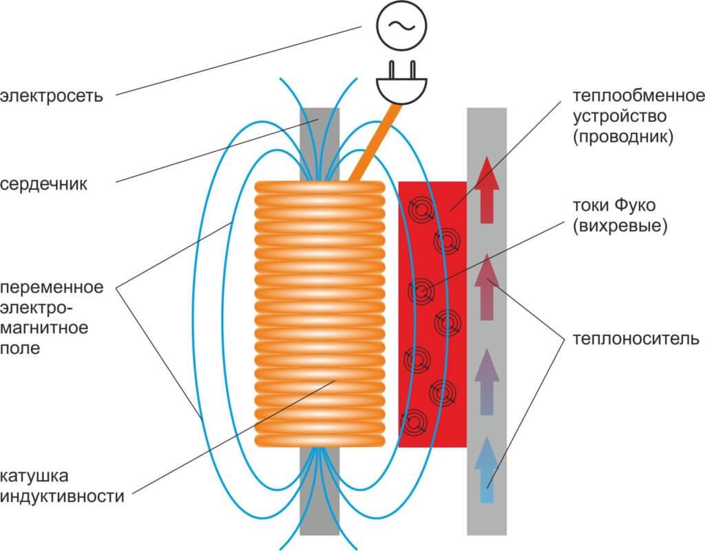 - Внутри индуктора располагается теплообменник, который за счет поступающих токов Фуко накаляется.