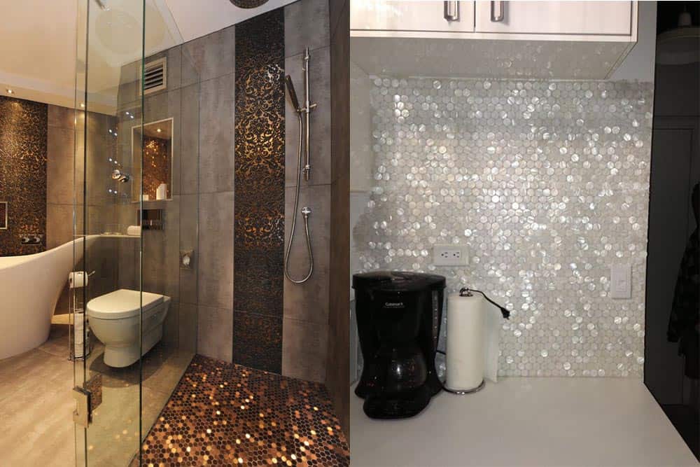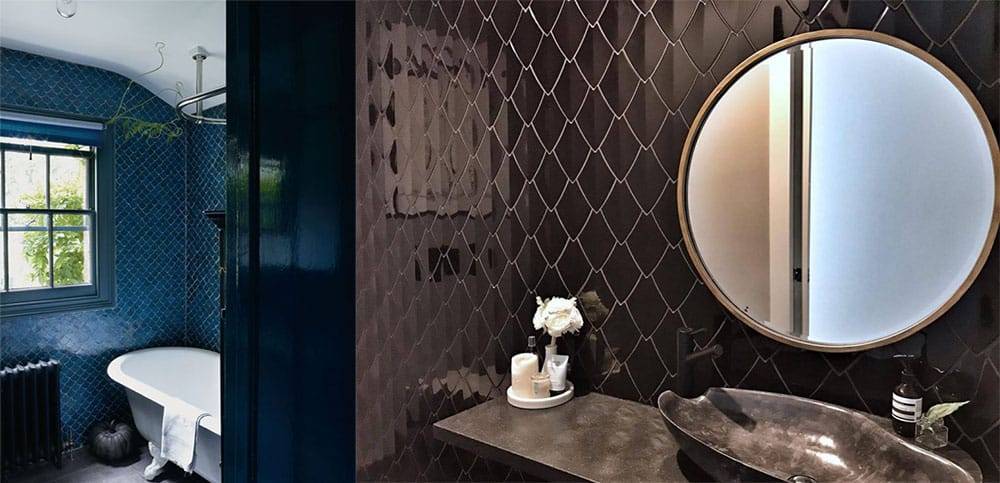 И глянцевые и матовые. Также можно поэкспериментировать с зеркальной мозаикой. Не избегайте насыщенных, темных цветов, от таинственного фиолетового и бордового до темно-синего и черного.