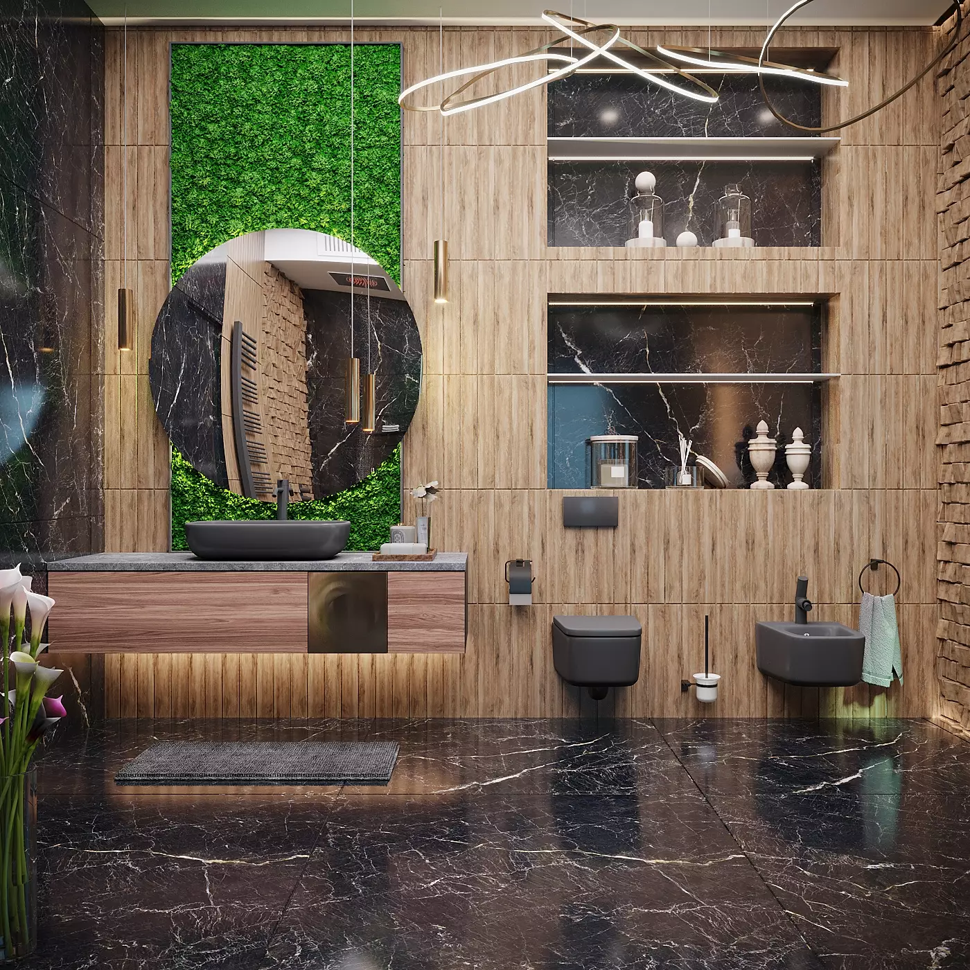 Эта современная ванная комната с черным мрамором демонстрирует привлекательную акцентную стену с богатой текстурой, полностью сделанную из зелени в зоне умывальника, которая мгновенно определяет ванную комнату, подчеркнутую биофильным дизайном, и служит прекрасным примером того, как вы можете сделать стиль определяющим для вашей ванной комнаты.