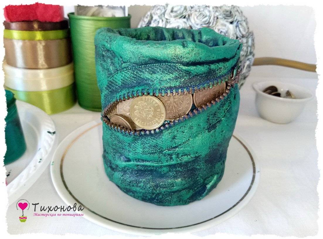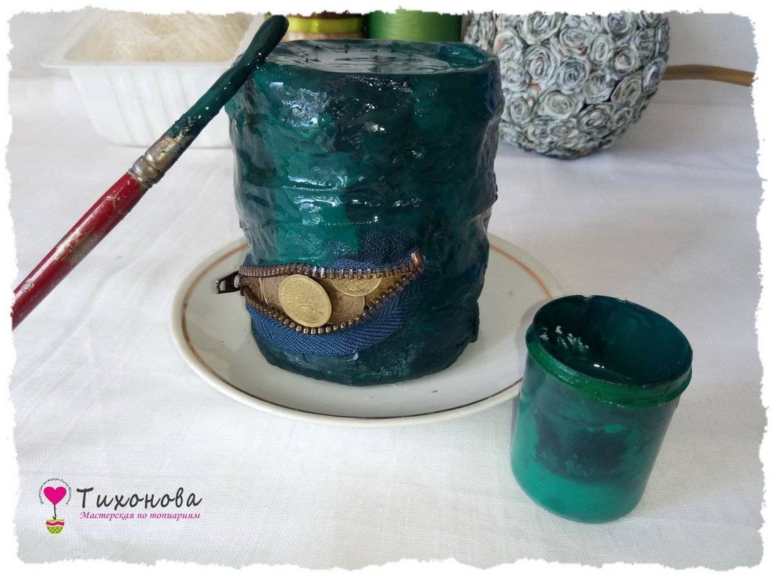 Подарок безусловно будет запоминающимся. Монетки в идеале приклеивать таким образом, чтобы получался аналог чешуи на рыбе. Правильно делать это с самого низа вазы, аккуратно продвигаясь к верху.