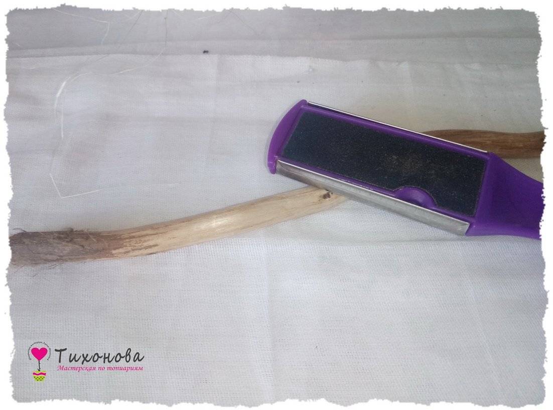 Именно сейчас удобно подготовить ствол для денежного топиария «Изобилие» — пока сохнет последний слой горшка. Заранее отшлифованную наждачной бумагой ветку корилуса (салекс) красим в 2 слоя бронзовым оттенком (золото + коричневая гуашь).