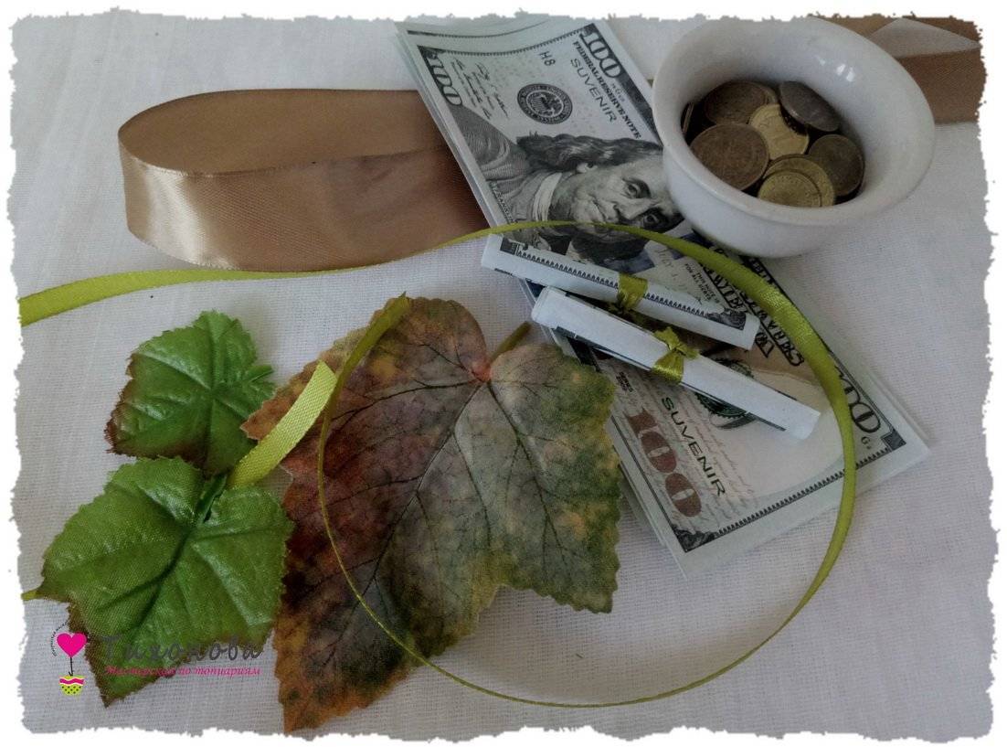 Делать это нужно осторожно, чтобы не испортить деньги – лучше всего скрутить трубочкой и привязать на нитке. Вручать такой подарок следует торжественно и так, чтобы каждый смог оценить вашу оригинальность. Не постесняйтесь подобрать специальные стихи и поздравления, чтобы буквально «зарядить» ваш подарок положительной энергетикой