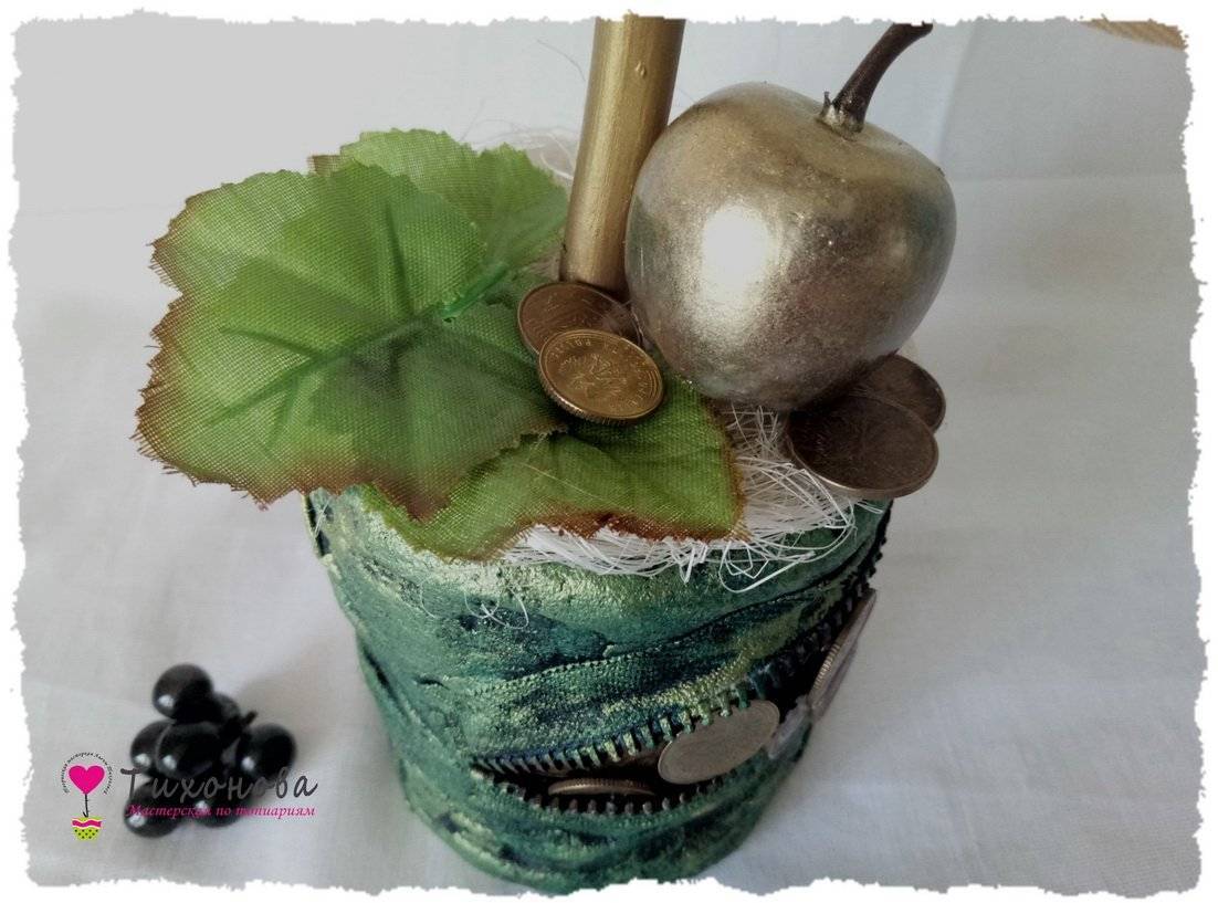 Большим листиком винограда отмечаем композиционный центр топиария, размещаем на кроне символы изобилия: плодородие, богатство, урожай. Расклеиваем монеты и скрученные бумажные купюры, прикрывая неказистые участки кроны.