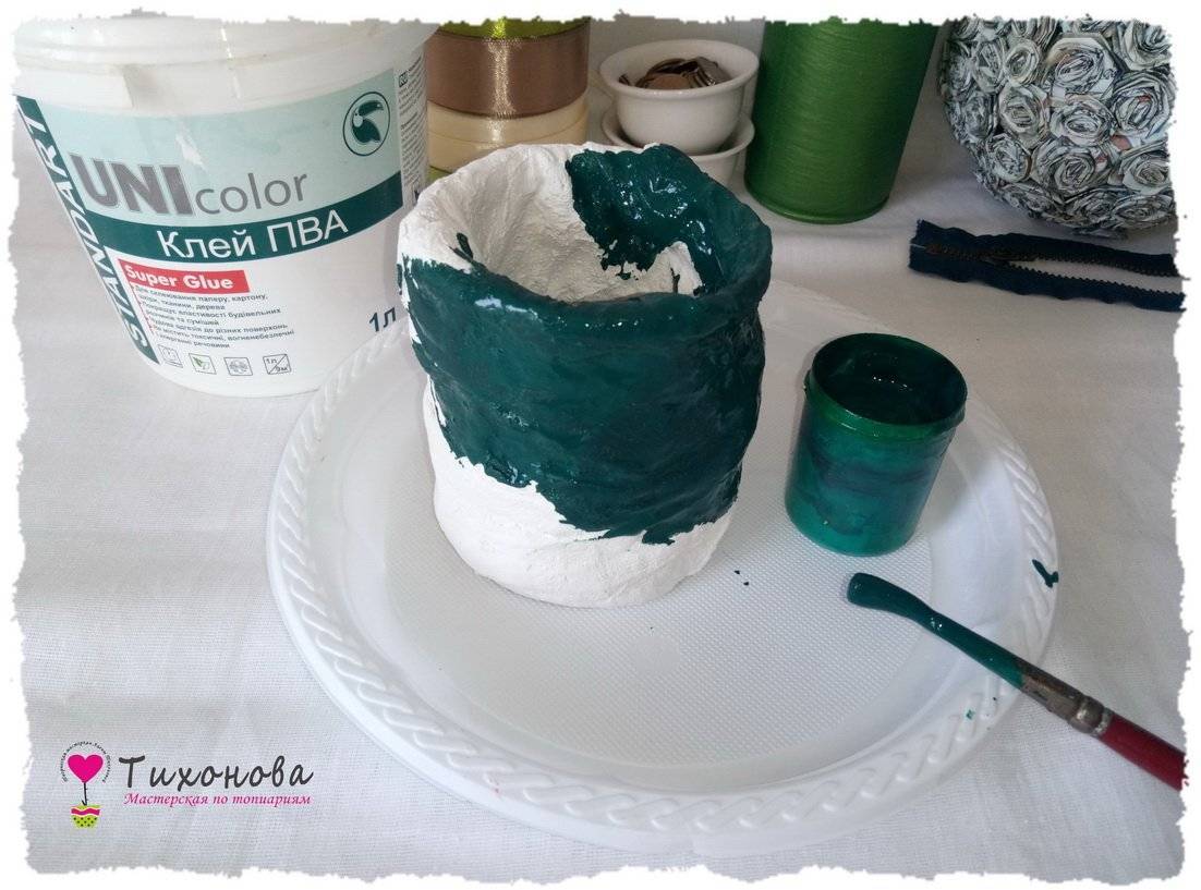 . Для этого палочка или веточка покрывается клеем и оборачивается декоративной ниткой, либо же лентой. Можно просто вскрыть акриловой краской, которая не смывается водой. - После подготовки ствола, он закрепляется в горшочек.
