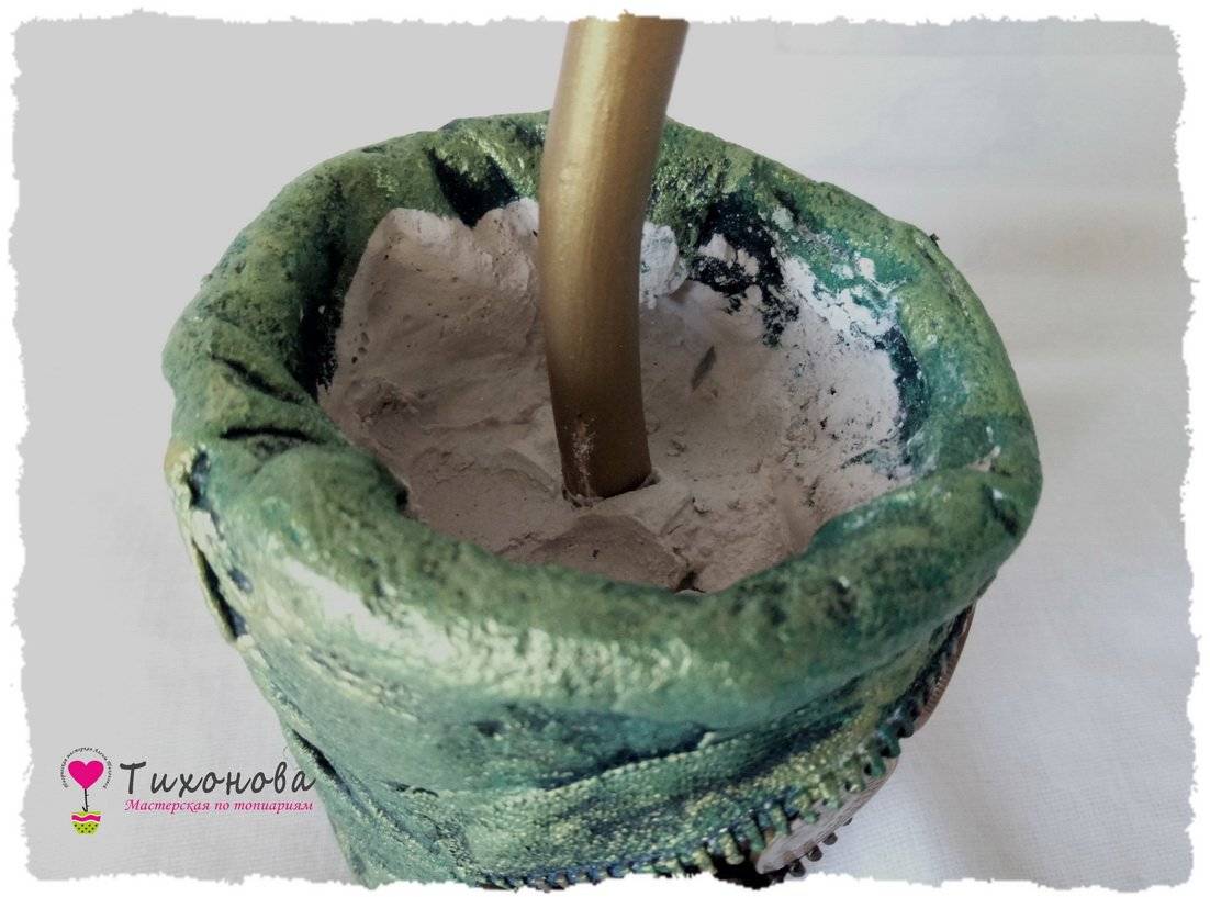 Ствол с подготовленной кроной фиксируем в горшке на гипсовую заливку. Если используется керамическая или стеклянная емкость, то в раствор добавляем кусочки пенопласта или губки. Все секреты крепления топиария раскрыты в отдельной статье.