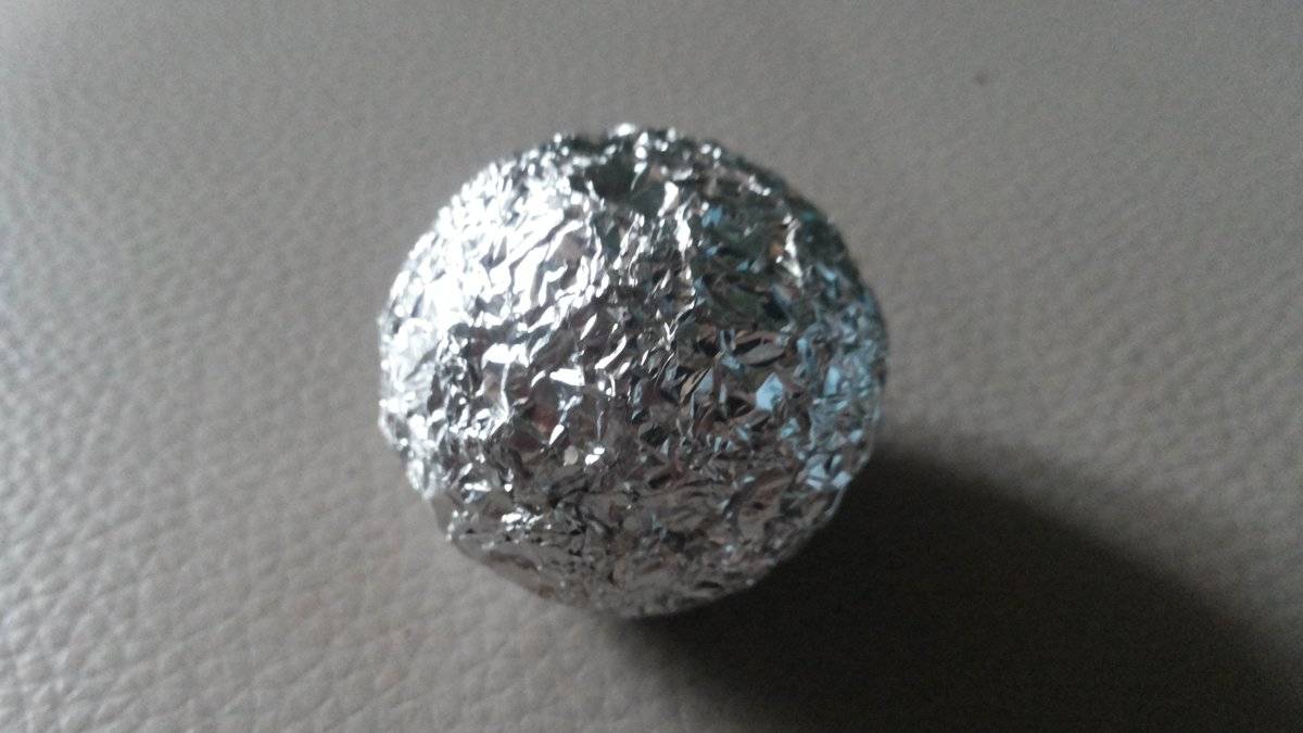 - Первое, что я сделал, это сделал шарик из алюминиевой фольги. Все очень просто: от рулона фольги я отвернула кусок примерно 30см, сложила его вчетверо, затем, придерживая края, скомкала их и придавила шарик руками.