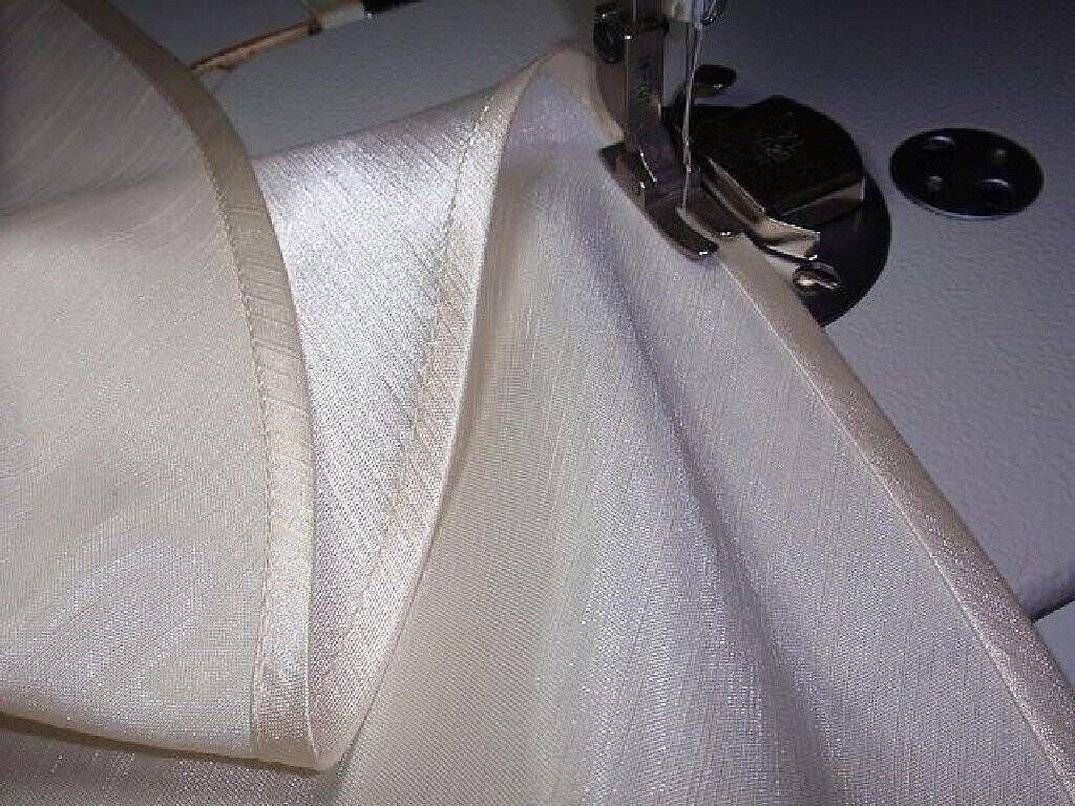 - Вручную на машинке — наиболее часто используемый способ. Главное, подобрать нитку точно в тон ткани, чтобы она была менее заметной. Толстую ткань достаточно подвернуть один раз, но тюль лучше подворачивать дважды. Перед подшивкой на машинке стоит сделать наметку вручную. Не рекомендуется закалывать ткань булавками, так как на тонком материале могут остаться следы. Правильный шов получится, только если шить уверенно, тогда строчка будет ровной.