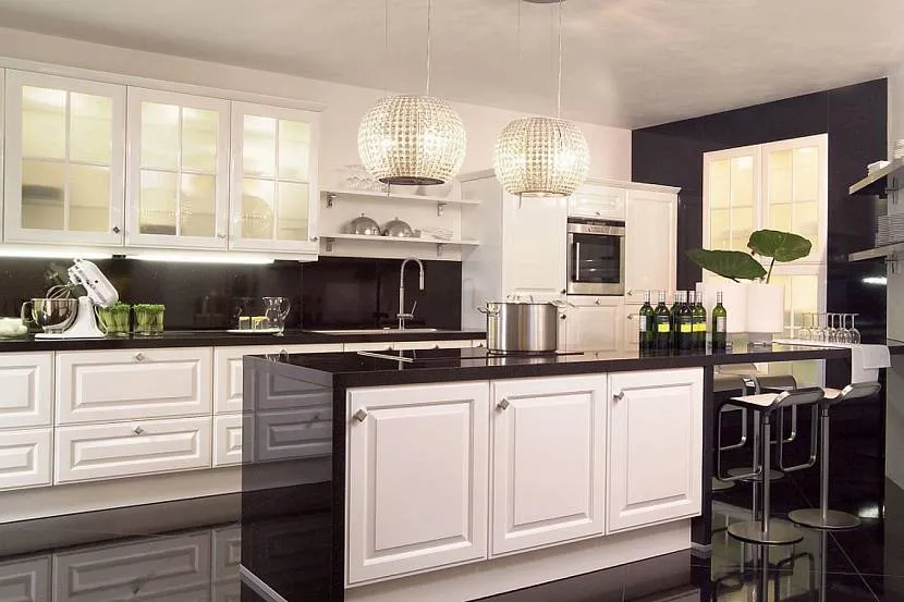 Наиболее стильным получается светлый интерьер с черной глянцевой поверхностью столешницы. Зеркальное отражение всех предметов зрительно увеличивает объем комнаты, придает интерьеру глубину.