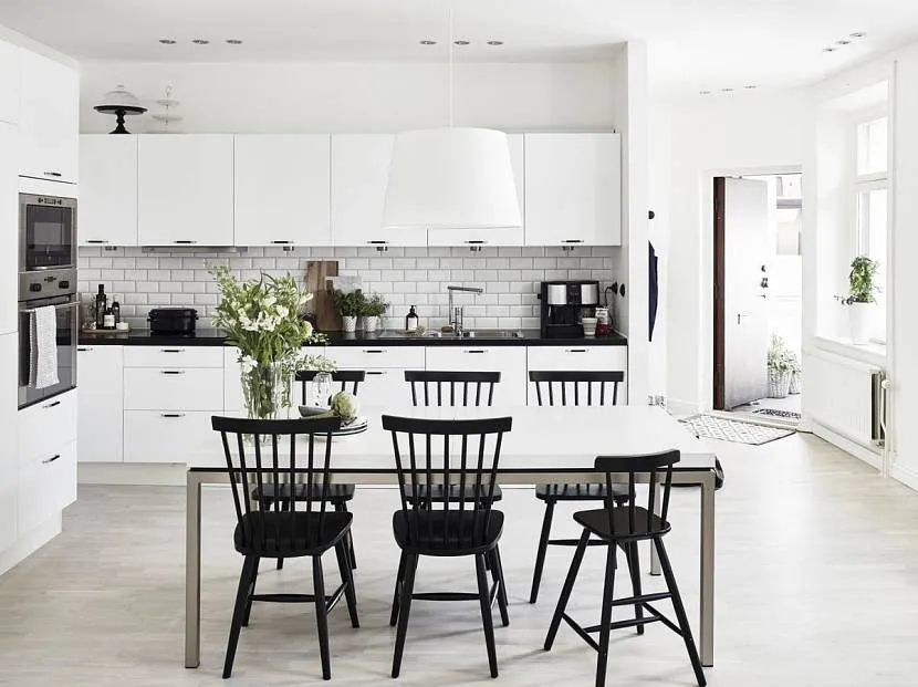 Фартуки выполняют в тон стен или делают серыми. Разбавить стерильность скандинавского стиля поможет натуральная древесина. Теплый коричневый на полу привносит в помещение домашний уют. В обеденной зоне уместен белый, кремовый или нежный пепельный.