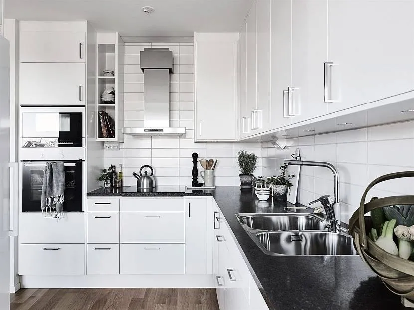 За счет белого оформления помещение кажется огромным и свободным. Используют мебельный гарнитур строгих линий и без лишнего декора. При помощи матовых и глянцевых поверхностей дизайнеры корректируют недостатки комнаты. Черная столешница в светлой кухне станет ярким пятном. В фасадах бытовой техники обыгрывают комбинацию основных цветов.