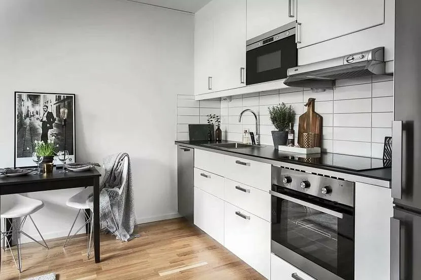 Бело-черная гамма в оформлении кухни выглядит впечатляюще. Преобладание светлых тонов визуально увеличивает пространство небольшой комнаты и спрячет технические недостатки помещения. Достоинства дизайна: