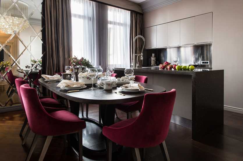 Разместите тут стол с круглой либо овальной столешницей, вмещающий несколько человек. Подберите к нему стулья из дерева со спинками, обтянутыми кожей или тканью.