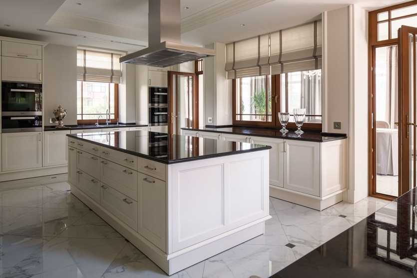 Пол в неоклассической кухне оформляется древесными материалами в виде паркета или ламината с имитацией натурального дерева – дуба или палисандра.Также уместно использование камня, мрамора, керамогранита или двухцветной плитки, выложенной в шахматном порядке.