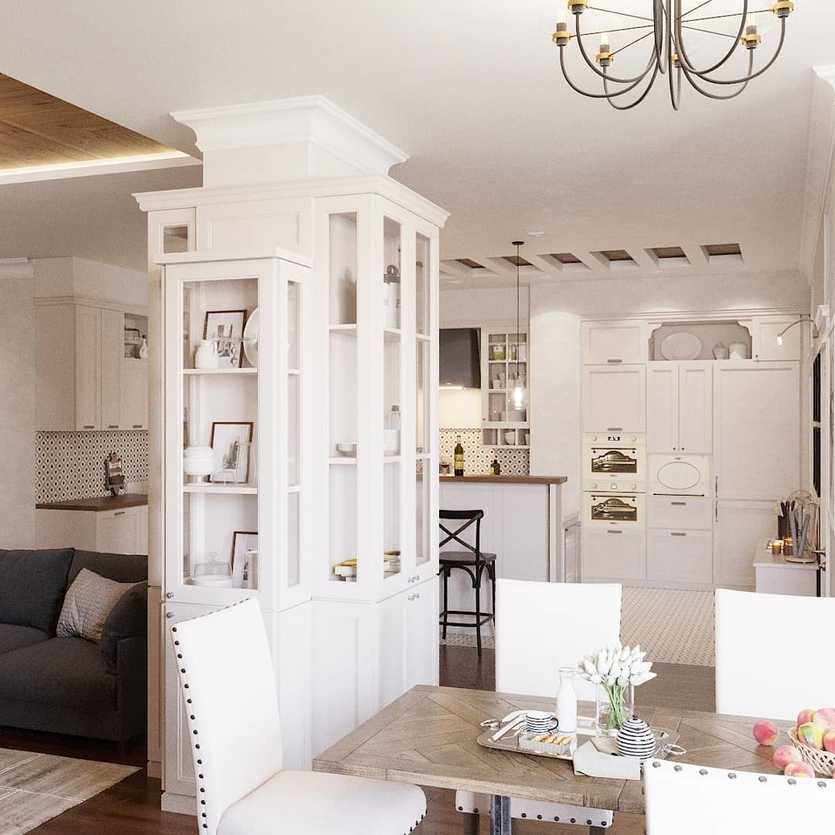 Если вы оформляете кухню-столовую или кухню-гостиную в стиле неоклассика, стоит позаботиться о зонировании. Кстати, для кухни-гостиной неоклассика — более удачный выбор, чем традиционно-классическая стилистика.