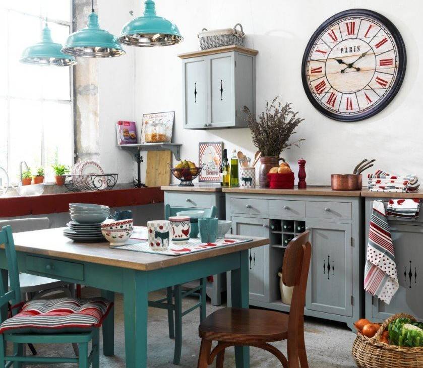 Дизайн кухни украшают старинными часами с римским циферблатом, лепниной из гипса, коваными позолоченными изделиями и другими изысканными аксессуарами.