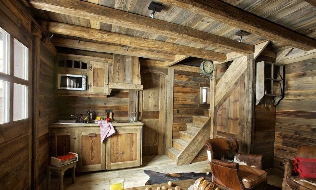 - сдержанная естественная палитра – преобладают все оттенки натуральной древесины и отделочного камня;