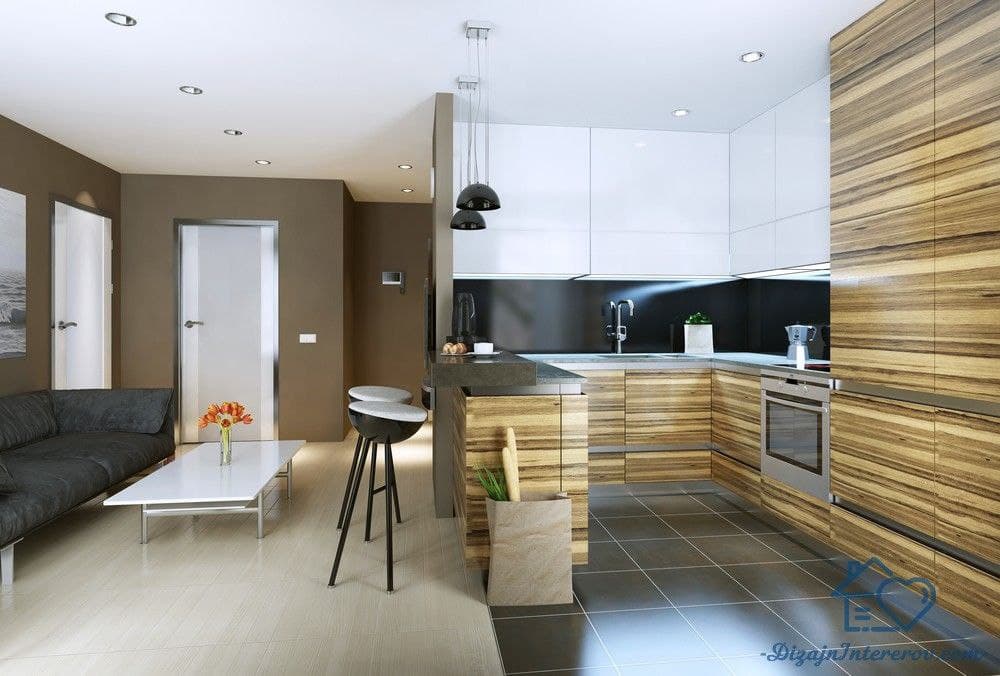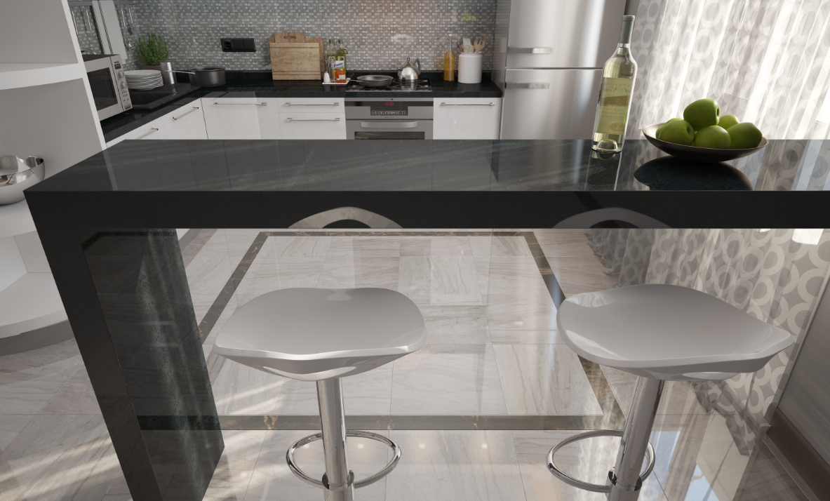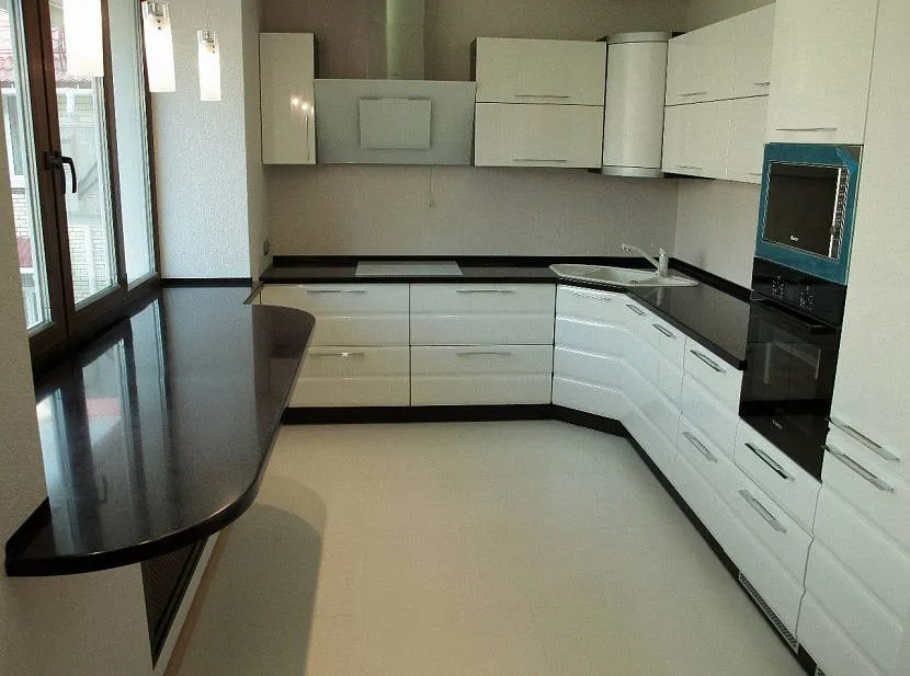 Комбинированные. В этом варианте столешница стойки примыкает к рабочей поверхности, но имеет другую высоту. Обычно рабочая поверхность направлена при этом в сторону кухни, а более высокая барная – в сторону столовой зоны.