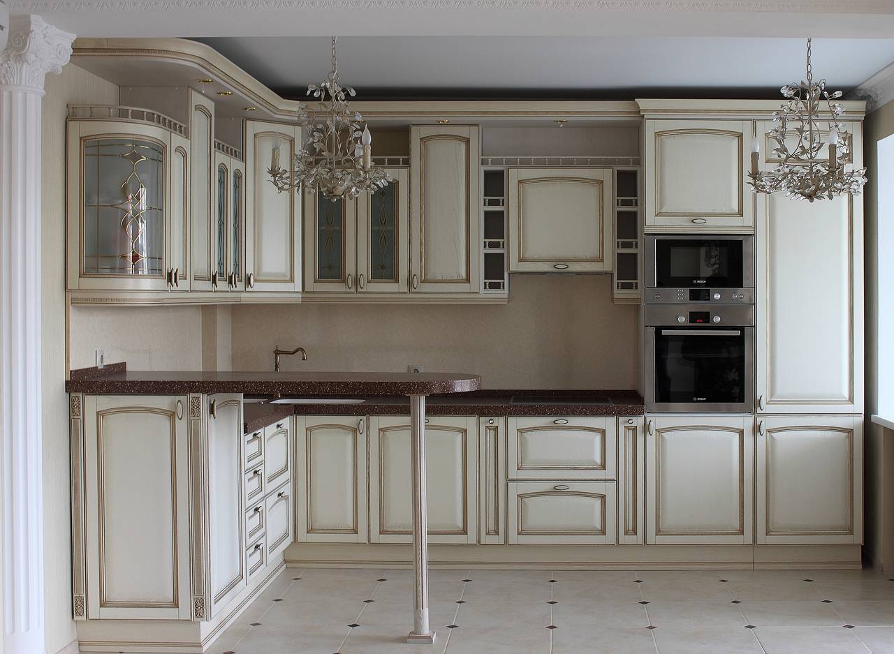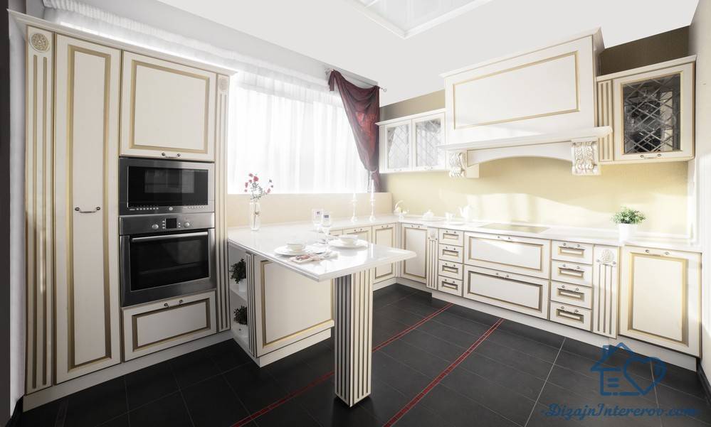 Так как в классическом стиле крайне важна сочетаемость всех элементов, барную стойку лучше выполнять из того же материала, что и кухонный гарнитур. Она может быть не отдельным элементом, а продолжать рабочую поверхность.