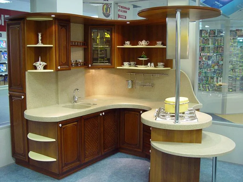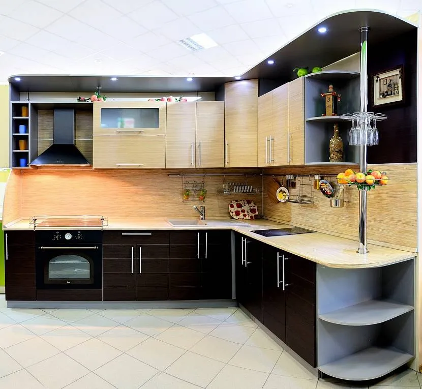 Покупая типовую угловую кухню, неподготовленные люди сталкиваются и с другой проблемой. Дело в том, что стандартные модели изготавливаются под прямой угол. Встроить в угол, который отклонился на 5-10 градусов такой гарнитур становится проблематично. Мебель выгнуть не получится, а зазоры между гарнитуром и стеной вряд ли удастся скрыть. Сильно видно такие погрешности под верхними шкафами и сбоку.