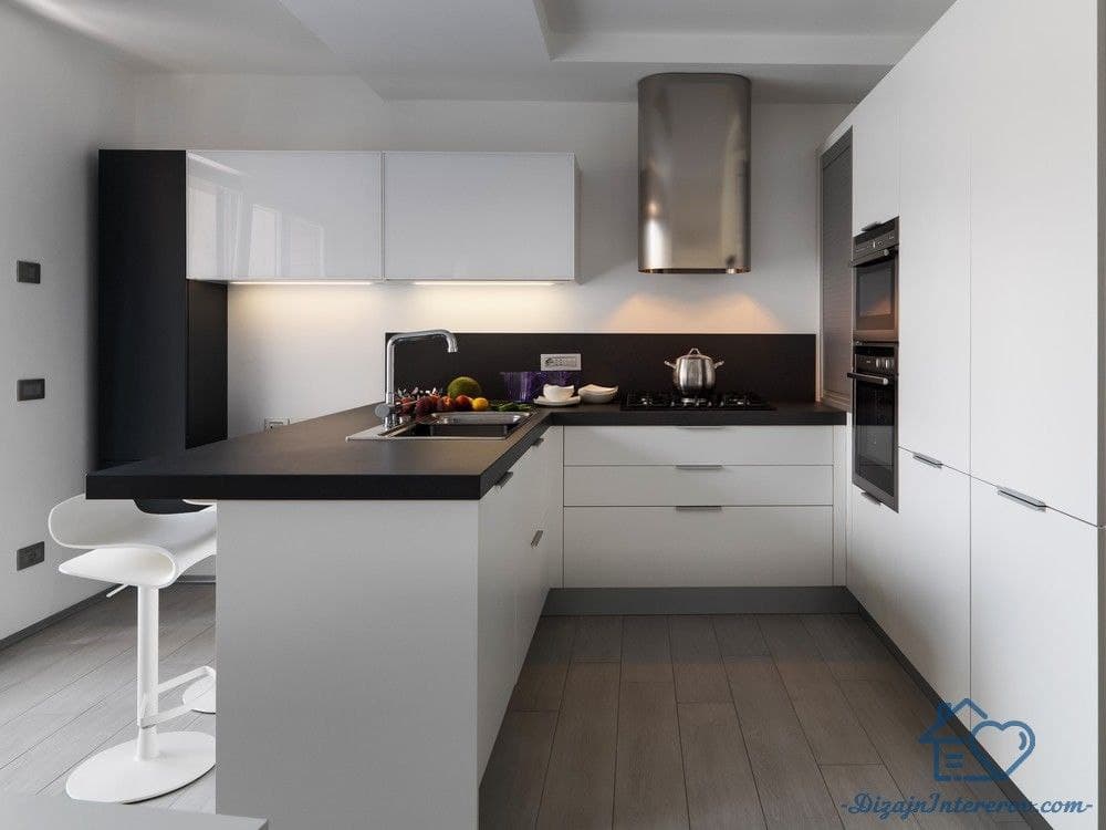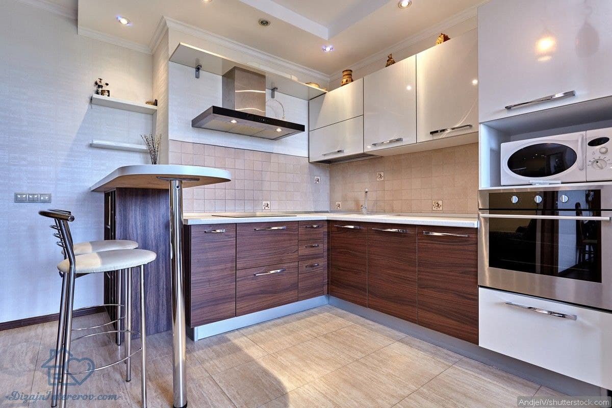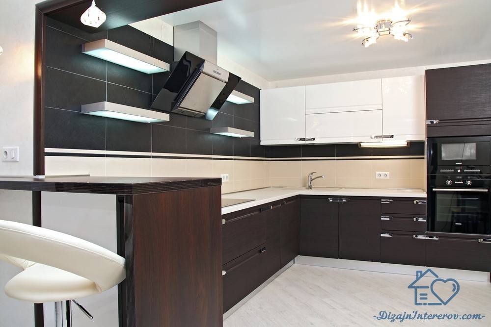 Несколько вариантов, как удачно можно разместить барную стойку и кухонный гарнитур в углу помещения: