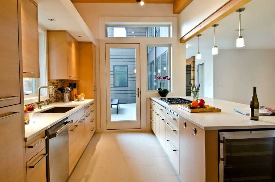 Для узких комнат коридорного типа также подойдет проект кухни с параллельной планировкой. Если не представляется возможным расположить все необходимые предметы вдоль линии одной стены, можно на одну половину поместить раковину и плиту, а на противоположную – холодильник, рабочие поверхности и мелкие электроприборы. Этот вариант гораздо удобнее предыдущего, при условии, что все необходимые объекты находятся в непосредственной близости.