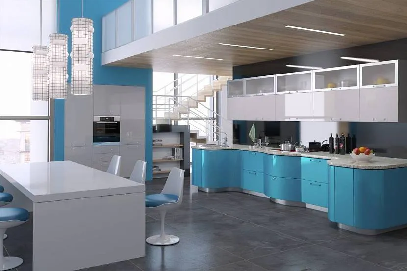 Бирюзовая кухня в интерьере, оформленном в современном стиле, прекрасно сочетается с оттенками серого цвета. В зависимости от насыщенности цветовой гаммы, интерьер может быть ярким, строгим, веселым, спокойным.