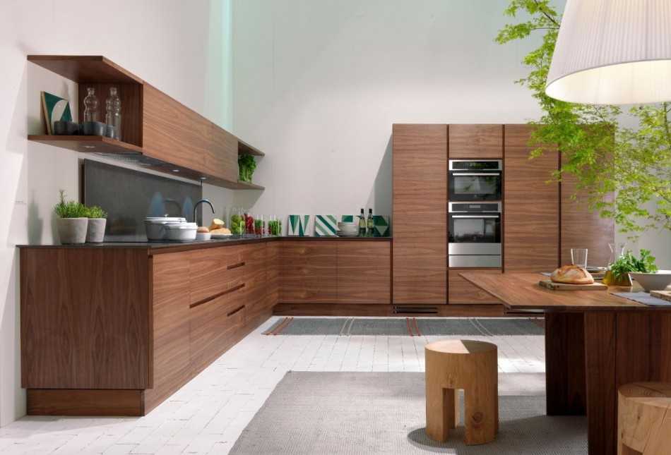 Наиболее уместные расцветки для фасадов для такой кухни — это все оттенки натурального дерева.
