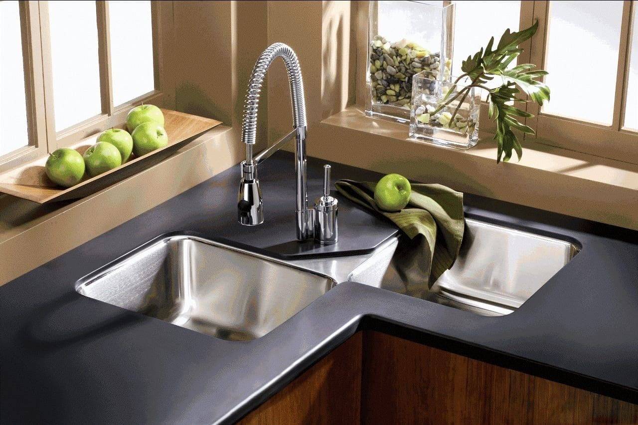 Другим интересным вариантом станет угловая установка двойной раковины. С одной стороны, в ней удобно мыть посуду, а с другой – сушить её или размораживать продукты. Если площадь мала, то двойная раковина станет всё же не лучшим вариантом, потому что значительно сократить столешницу, то есть пространство для работы.