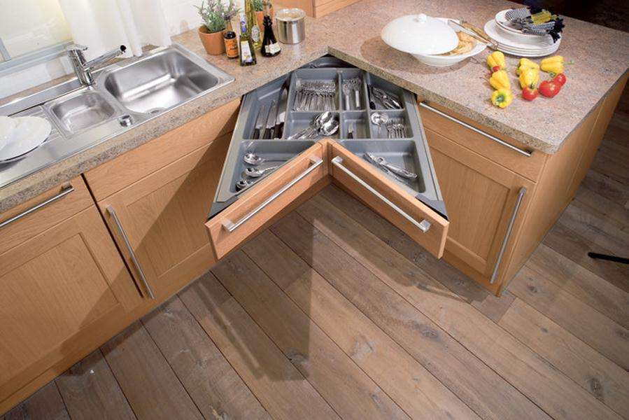 В угловом гарнитуре делайте максимально вместительным угловой модуль, установив систему «умный уголок».