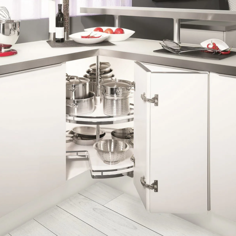 - Вращающийся поддон для хранения — это удобный способ хранения кухонных принадлежностей в угловом шкафу. Такой поддон позволяет максимально эффективно использовать угловое пространство и легко получать доступ к нужным предметам.