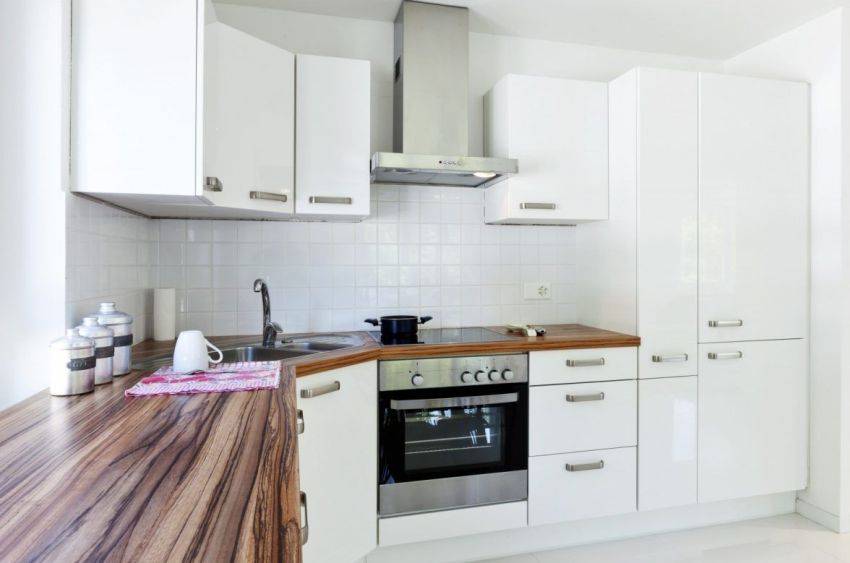 Еще одним проблемным местом таких секций является столешница. Здесь трудно использовать стандартное полотно, поэтому приходится составлять ее из нескольких сегментов. Это актуально для изделий из ламината или постформинга. Выходом может стать использование искусственного камня. По размеру рабочей поверхности подбираются накладные мойки.