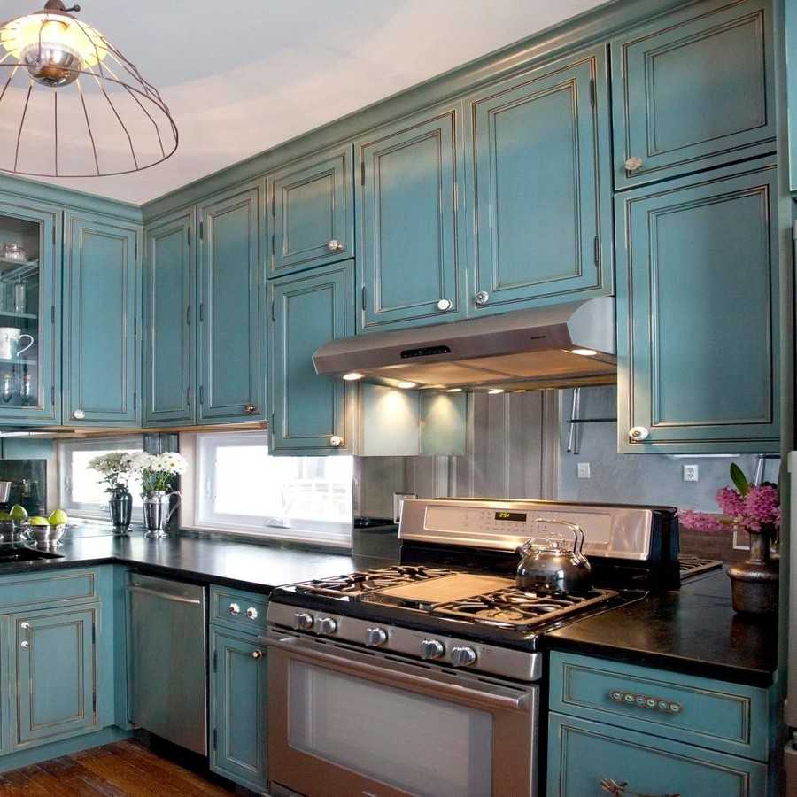 Очень красиво смотрится кухонный гарнитур с патинированными фасадами