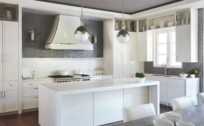 При этом все зоны рабочей поверхности расположены очень удобным образом, а ширина столешницы дает ей возможность выполнять роль барной стойки. Ведь это очень удобно, когда можно общаться с гостями, не отрываясь от процесса приготовления пищи.