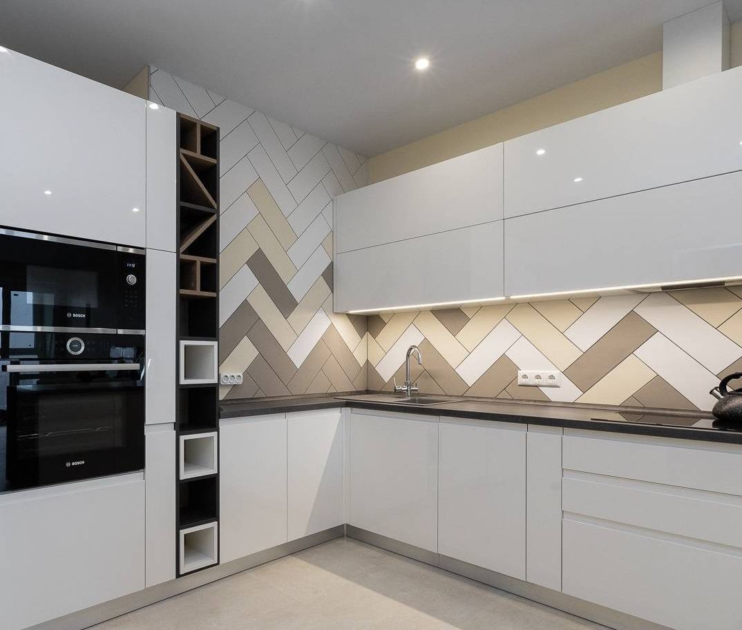 Такая идея интересна и полезна для дизайна небольших кухонных гарнитуров в форме буквы “Г”, потому что даёт возможность сделать пространство свободнее, не лишив его функциональности из-за того, что гарнитур с одной стороны будет по глубине меньше, чем с другой.