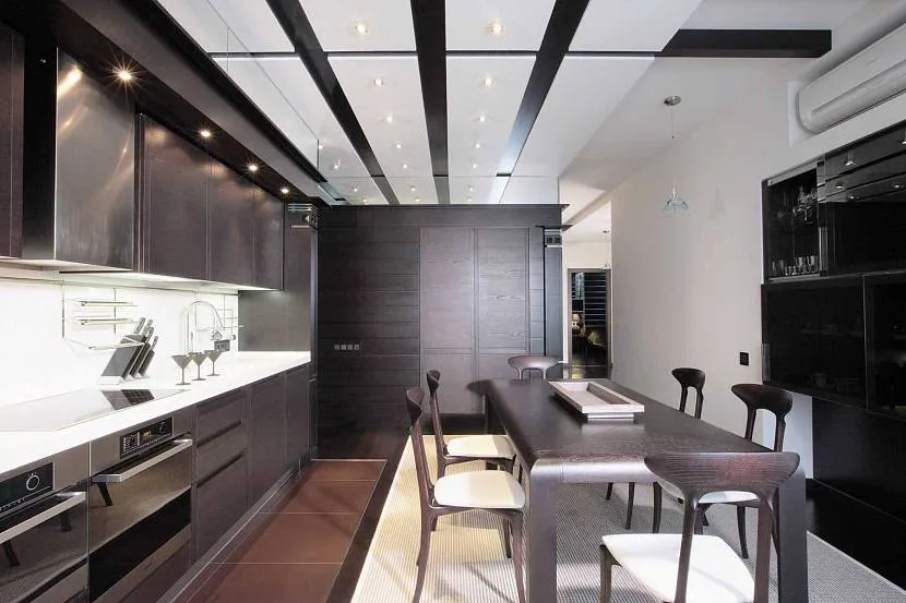 Такое расположение кухонного гарнитура идеально подойдет для квадратного пространства. На кухне площадью 14 кв. м. еще и останется место для полноценной обеденной зоны. Учитывайте, что между предметами мебели, находящимися напротив друг друга должно быть соблюдено определенное расстояние, которого будет достаточно для использования вещей (как правило, такое расстояние должно быть не менее 1,2 метра).