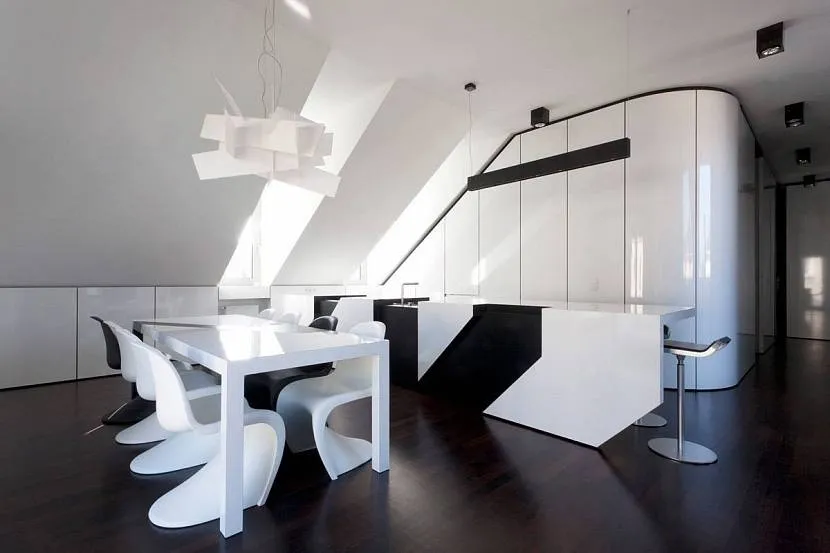 Сиденье дивана является продолжением криволинейного изгиба в интерьере кухни в стиле футуризм Источник Italstroy.ru