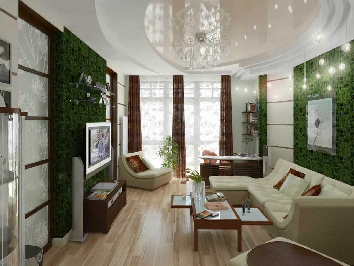 Не стоит считать их скучными – эти цвета отлично сочетаются с любыми другими. При общей спокойной гамме можно выделить яркие пятна – шторы, подушки, коврики. Гостиная предназначена для отдыха, но не стоит бояться экспериментировать. Также в моде природные оттенки, которые настраивают на спокойный лад. Популярность набирает одно из самых интересных дизайнерских решений – зал-лес.