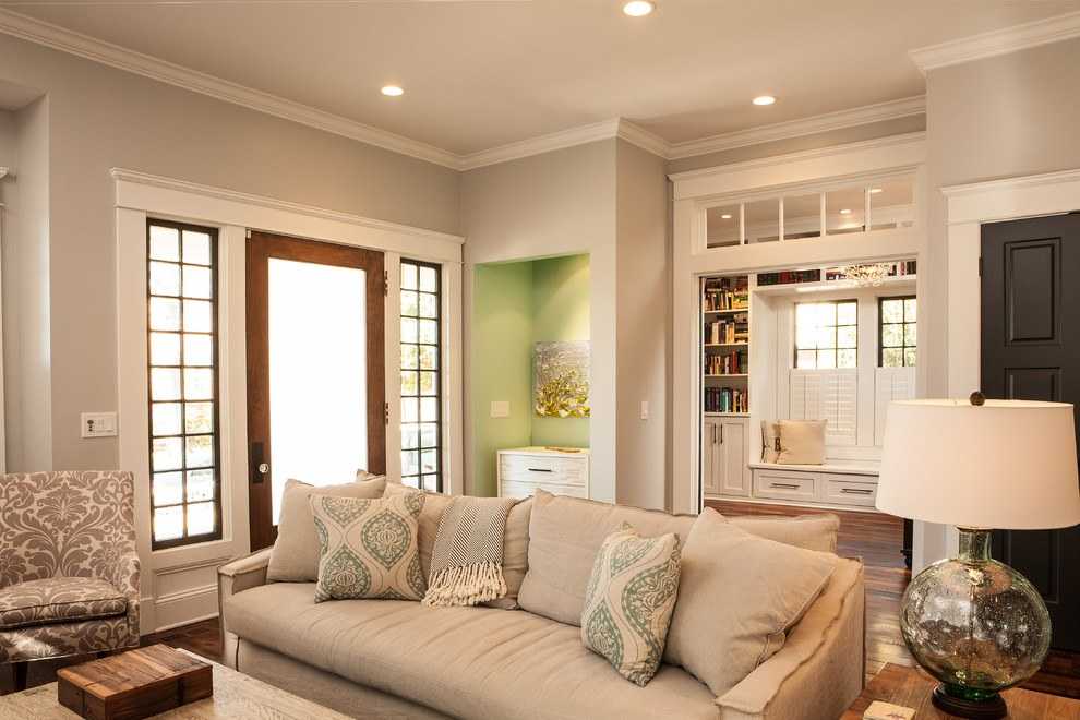 - Большое количество естественного света, создающего ощущение лёгкости и свободы. Чем больше оконные проёмы и меньше площадь комнаты, тем сильнее она освещена. При оформлении хорошо освещённого помещения можно использовать тёмные цвета, не боясь, что обстановка будет выглядеть мрачной;